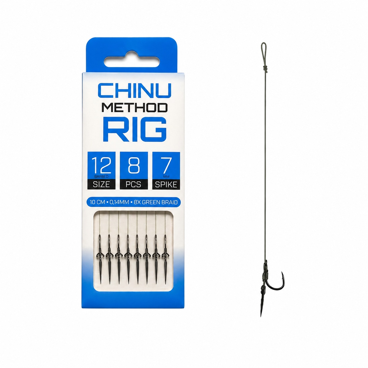 CHINU Method Feeder Rig Braid je set od 8 ručno vezanih method feeder predveza izrađenih na kvalitetnoj 8x upredenici, namijenjenih modernom feeder ribolovu. Svaki predvez opremljen je harpunom (bait spike) za brzo i sigurno postavljanje peleta ili waftera.