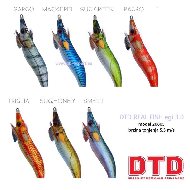 DTD Real Fish Egi 3.0 je skosavica za lignje inspirirana prirodom, predstavljena na svjetskom sajmu ribolovnog pribora EFTTEX Warsaw. Dizajnirana je da maksimalno imitira izgled i ponašanje prirodne ribe, što uz vrhunski balans daje iznimne rezultate u lovu lignji i sipa.
